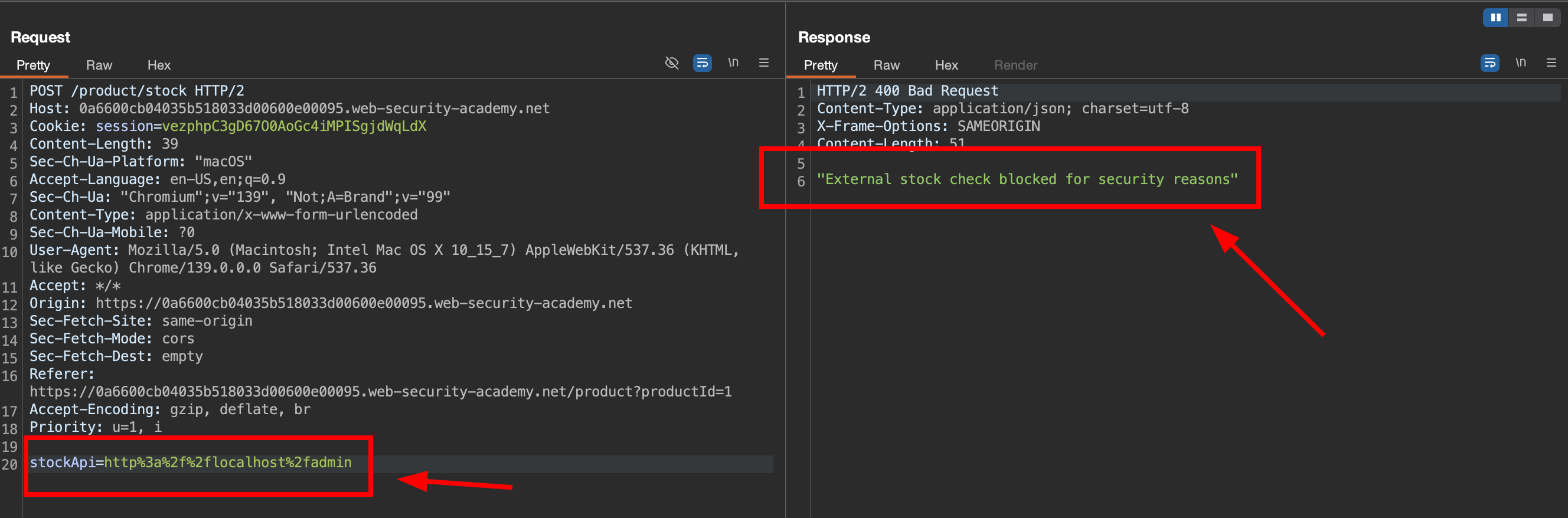This lab has a stock check feature which fetches data from an internal system. To solve the lab, change the stock check URL to access the admin interface at http://localhost/admin and delete the user carlos. The developer has deployed two weak anti-SSRF defenses that you will need to bypass.